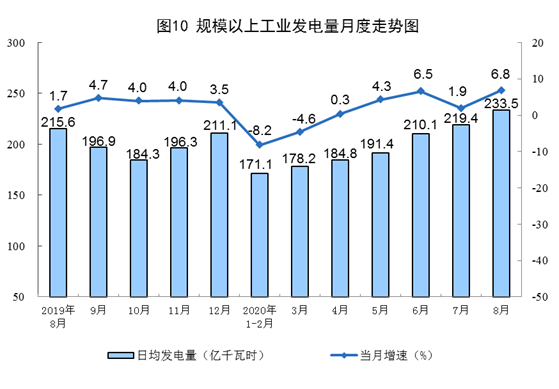 電力生產(chǎn)較快增長。8月份,發(fā)電量7238億千瓦時,同比增長6.8%,增速比上月加快4.9個百分點;日均發(fā)電量233.5億千瓦時,環(huán)比增加14.1億千瓦時。1—8月份,發(fā)電量47728億千瓦時,同比增長0.3%。