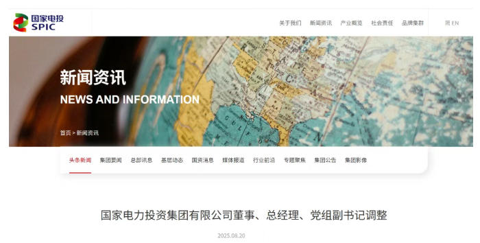 2025年8月20日,國家電力投資集團(tuán)有限公司召開領(lǐng)導(dǎo)班子(擴(kuò)大)會議。受中央組織部領(lǐng)導(dǎo)委托,中央組織部有關(guān)干部局負(fù)責(zé)同志宣布了黨中央關(guān)于國家電力投資集團(tuán)有限公司總經(jīng)理調(diào)整的決定: