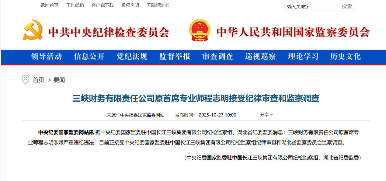 10月27日,中央紀委國家監(jiān)委網站信息顯示,據(jù)中央紀委國家監(jiān)委駐中國長江三峽集團有限公司紀檢監(jiān)察組、湖北省紀委監(jiān)委消息:三峽財務有限責任公司原首席專業(yè)師程志明涉嫌嚴重違紀違法,目前正接受中央紀委國家監(jiān)委駐中國長江三峽集團有限公司紀檢監(jiān)察組紀律審查和湖北省監(jiān)察委員會監(jiān)察調查。