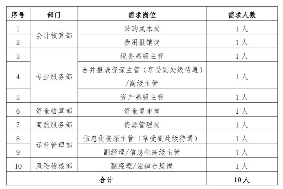 除上述基本條件、資格要求外,應(yīng)聘人員還應(yīng)符合《財(cái)務(wù)共享中心2022年社會(huì)招聘崗位需求表》(附件)中的資格要求。