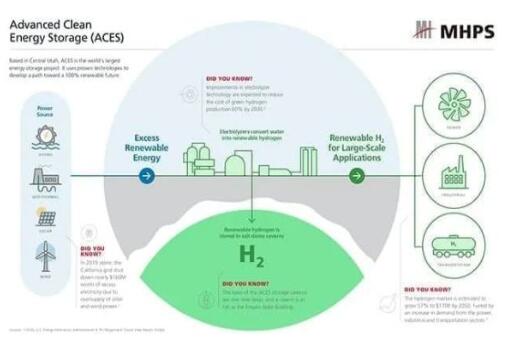 MHPS還通過猶他州高級清潔能源存儲(ACES)項目,開發(fā)了網(wǎng)格化大規(guī)模的可再生氫生產(chǎn)和存儲技術(shù)。ACES項目使用可再生能源通過電解生產(chǎn)氫氣。氫氣將在現(xiàn)場的地下鹽穴實現(xiàn)跨季節(jié)存儲,并供給墨西哥灣沿岸的煉油廠。當風、光可再生能源發(fā)電受限時,存儲的可再生氫可以直接發(fā)電。