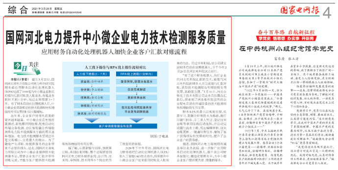 截至3月22日,國(guó)網(wǎng)河北省電力有限公司電力科學(xué)研究院財(cái)務(wù)部應(yīng)用財(cái)務(wù)自動(dòng)化處理機(jī)器人(RPA) 完成了1000筆與中小微企業(yè)相關(guān)的銀行匯款對(duì)賬及入賬業(yè)務(wù),每筆業(yè)務(wù)耗時(shí)不到1分鐘,而過(guò)去則需要3~7天。有了財(cái)務(wù)自動(dòng)化處理機(jī)器人后,中小微企業(yè)獲取相應(yīng)的技術(shù)檢測(cè)報(bào)告和增值稅專用發(fā)票的時(shí)間大幅縮短。