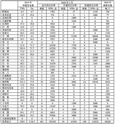 2020年2月全球核反應(yīng)堆及鈾需求