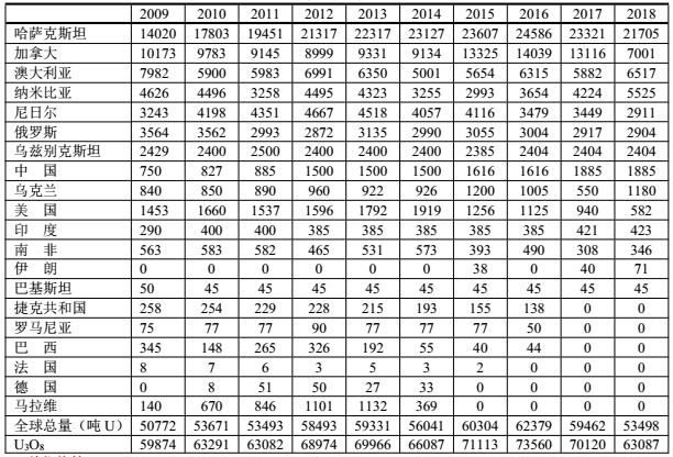 本數(shù)據(jù)是世界核能協(xié)會(huì)(WNA)于 2019年8月份提供的從鈾礦生產(chǎn)(公噸U)的數(shù)據(jù)。