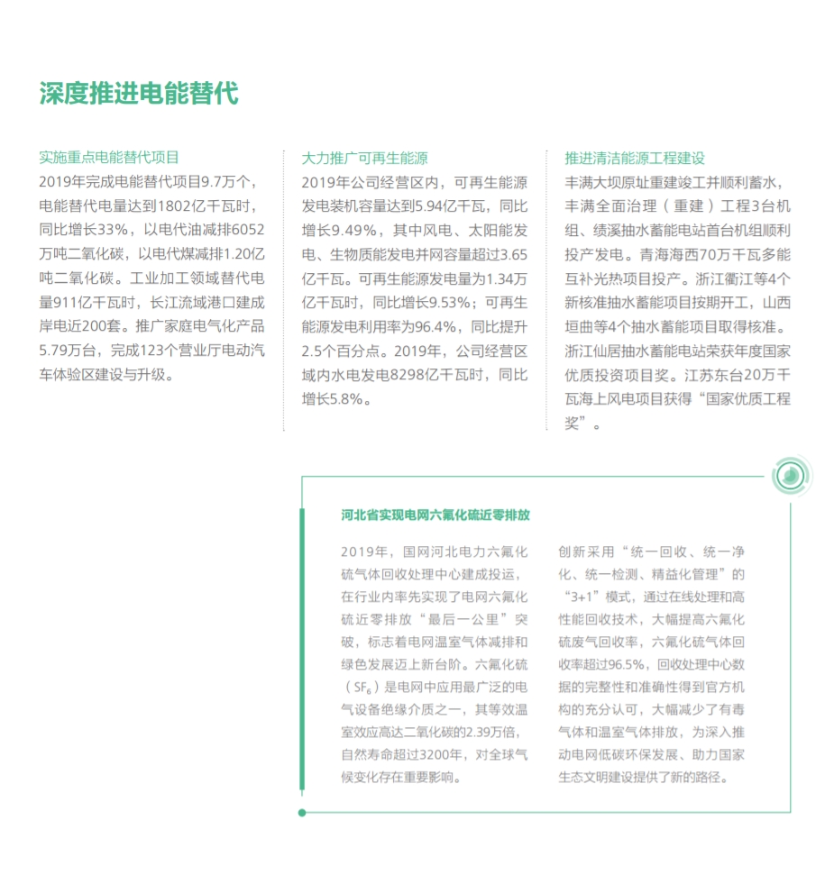 在努力做綠色發(fā)展的表率方面,國(guó)家電網(wǎng)有限公司認(rèn)真貫徹落實(shí)綠色發(fā)展理念,全力推進(jìn)生態(tài)文明建設(shè),推動(dòng)能源更高質(zhì)量、更可持續(xù)發(fā)展,以綠色低碳高效的充足電能,全力服務(wù)美麗中國(guó)建設(shè)。2019年經(jīng)營(yíng)區(qū)新增新能源并網(wǎng)容量3405萬(wàn)千瓦,新能源并網(wǎng)容量累積達(dá)到34842萬(wàn)千瓦,同比增長(zhǎng)16.1%,新能源云平臺(tái)接入新能源場(chǎng)站55萬(wàn)余座、裝機(jī)容量2.3億千瓦,累計(jì)交易額754.3億元,帶動(dòng)產(chǎn)業(yè)鏈上下游3000余家企業(yè)協(xié)同發(fā)展;完成電能替代項(xiàng)目9.7萬(wàn)個(gè),電能替代電量達(dá)到1802億千萬(wàn)時(shí),“煤改電”配套電網(wǎng)建設(shè)惠及19684個(gè)村、372萬(wàn)戶居民,以電代油減排二氧化碳6052萬(wàn)噸,以電代煤減排二氧化碳1.20億噸;智慧車聯(lián)網(wǎng)平臺(tái)累計(jì)接入充電樁43萬(wàn)個(gè),充電量達(dá)14.82 億千瓦時(shí),同比增長(zhǎng)73.86%。