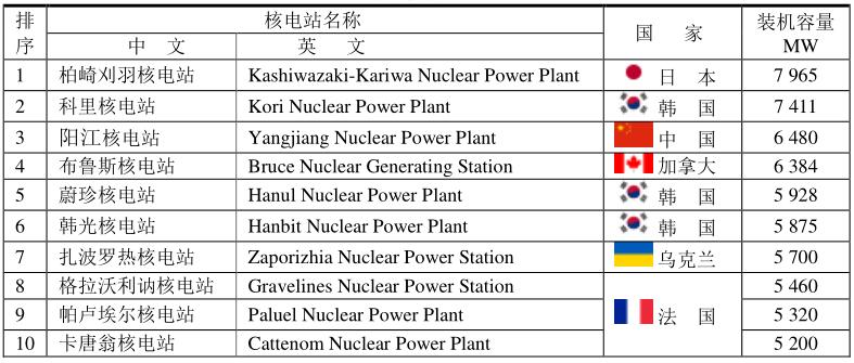 世界上最大的核電站是日本柏崎刈羽核電站,裝機容量為7965MW,但2011年已經(jīng)停工。值得注意的是韓國核電站進展很快,前十位核電站就占有3席,把美國和日本都摔到后面。