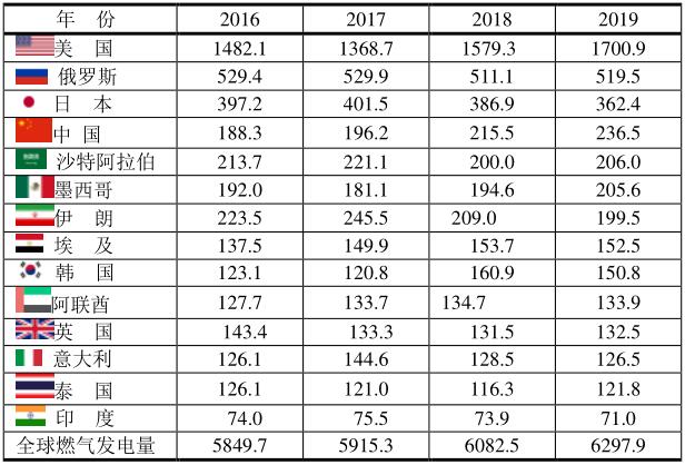 2016~2019年前14位燃氣發(fā)電最大的國家(單位:TWh)