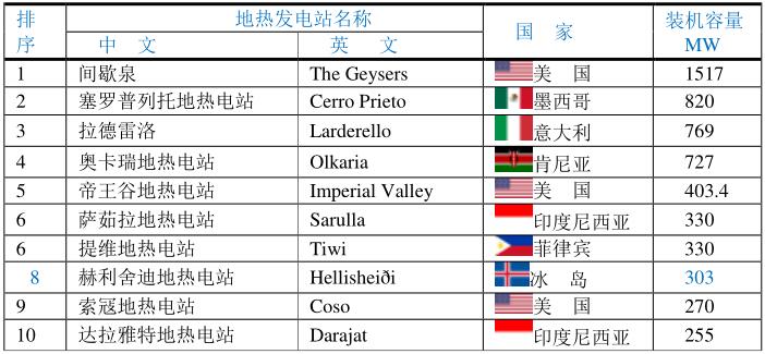 1904年由坎梯(Prince Piero Ginori Conti)建成了世界上最早的地熱電站—拉德瑞羅地熱田(Larderello Geothermal Power Station)。世界上最大的地熱發(fā)電廠群位于美國加利福尼亞州的地熱田間歇泉(The Geysers)。目前分別占該國發(fā)電總量較多的國家是肯尼亞(51%)、冰島(30%)、菲律賓(27%)、薩爾瓦多(25%)和新西蘭(14.5%)等。