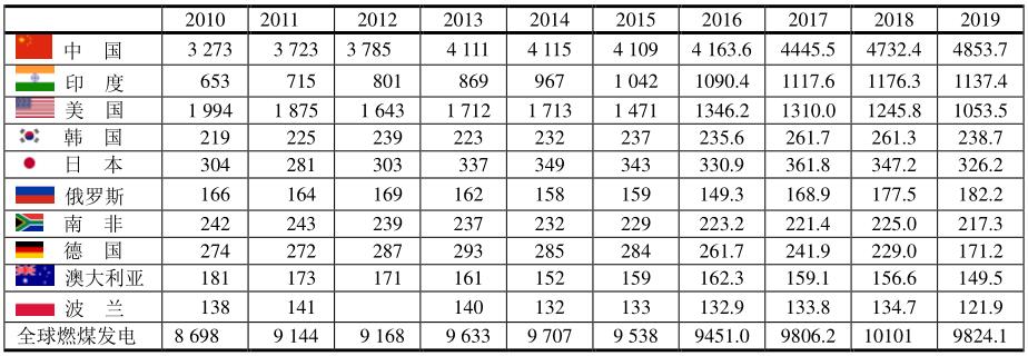 2010~2019年燃煤發(fā)電前十位國家(單位:TWh)